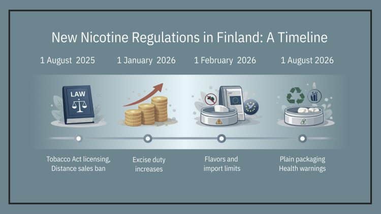 Finland is implementing a range of new regulations between 2025 and 2027. Below is a summary of the new nicotine regulations in Finland that have the potential to reshape the country’s nicotine pouch market.