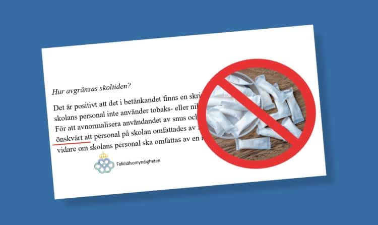 I sitt remissvar till utredningen En trygg uppväxt utan nikotin, alkohol och lustgas, som skickades in i fjol (augusti 2024), uttrycker Folkhälsomyndigheten att det vore “önskvärt” att även skolpersonal inte snusar på skoltid. Syftet sägs vara att minska normaliseringen av nikotinbruk i skolmiljö.